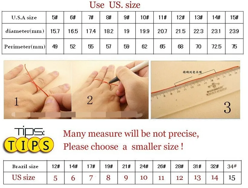 Для того, чтобы определить размер кольца, на Алиэкспресс предусмотрена инструкция, с помощью которой можно определить диаметр кольца и точно подобрать кольцо по размеру. Есть множество способов, как выбрать размер кольца, которые позволяют максимально точно измерить окружность пальца и уже по ней выбрать размер. Самый простой способ, как подобрать кольцо по размеру, это взять отрезок нити и обернуть ее вокруг пальца по выступающей части, то есть на месте изгиба фаланги, затем отрезать фрагмент, который соответствует окружности и сопоставить этот отрезок с линейкой.