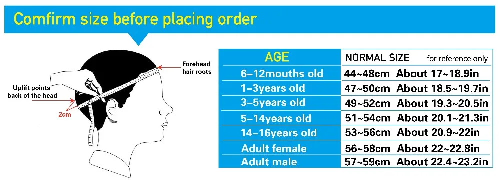 | Обхват головы (см) | 54 | 55 | 56 | 58 | 59 | 61 | 63 | 64 |