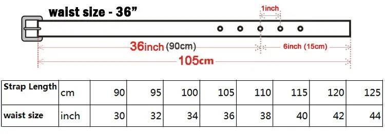 У разі ременя з пряжкою розміру 100 середня петля має довжину близько 100 сантиметрів, залишаючи близько 8 см в обох напрямках (на випадок, якщо зміниться окружність талії).