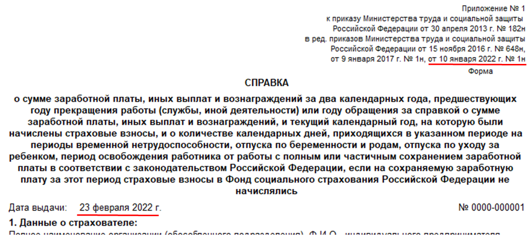 В отличие от двух предыдущих видов справок для данной есть нормативно увержденная форма, которая содержится в приказе Министерства труда и соцзащиты от 30.04.2013 № 182н. До 2023 года она применяется в редакции приказа Минтруда от 09.01.2017 № 1н (действует с 06.02.2017).